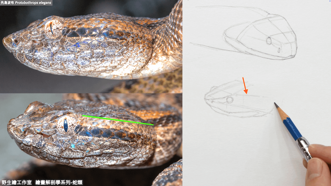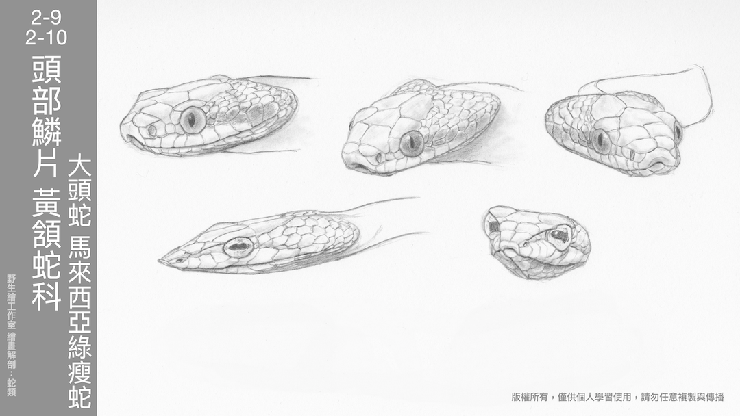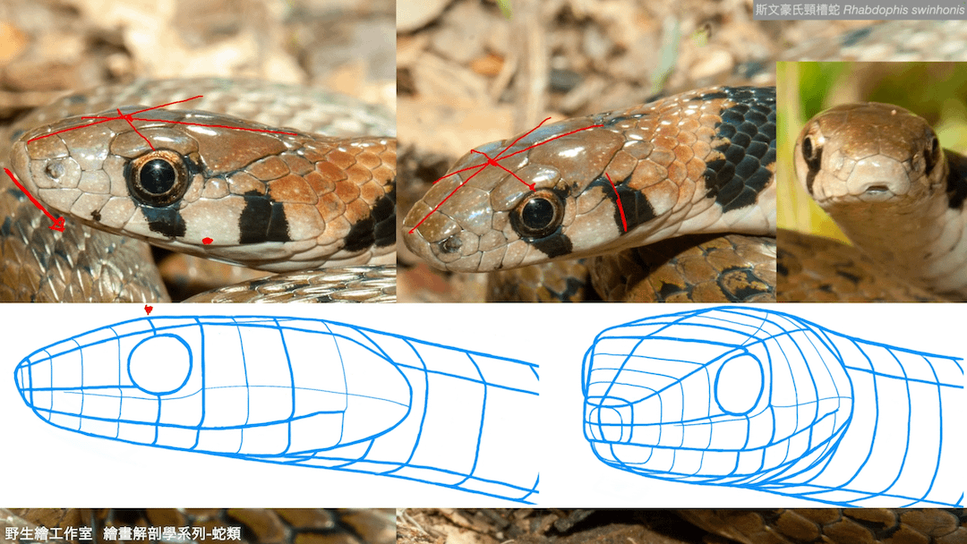 掌握正確的造型結構會比急著畫出鱗片來得重要,本章節以黃頷蛇科為基礎,介紹蛇類與蜥蜴頭部的基本差異,蛇類頭部的基本立體造型,張嘴時的細部構造與骨骼影響,並比較不同類群之間的變化,以及蛇吐信時的重點等。頭部是蛇類繪畫中最矚目的焦點,因此在中本章節先打好最重要的基礎。