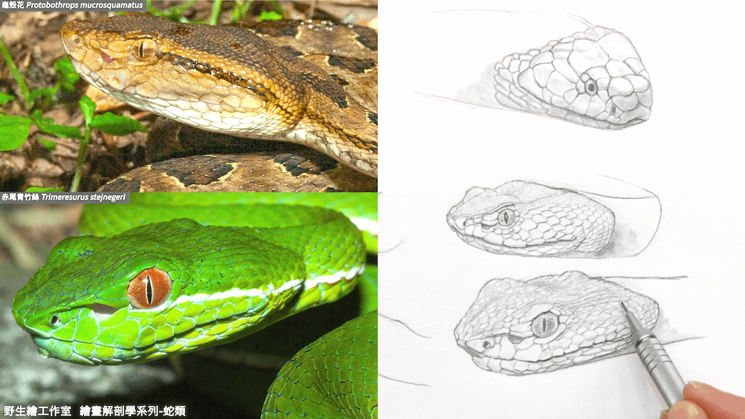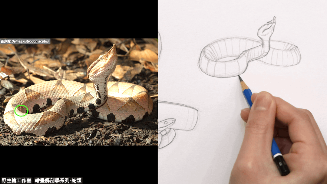 課程中也提供詳細的講義以及大量的實際照片來幫助各位理解蛇類的型態與鱗片的變化。所有單元皆有數個實際繪圖示範影片,幫助大家了解如何在繪畫過程中實際運用學到的知識。