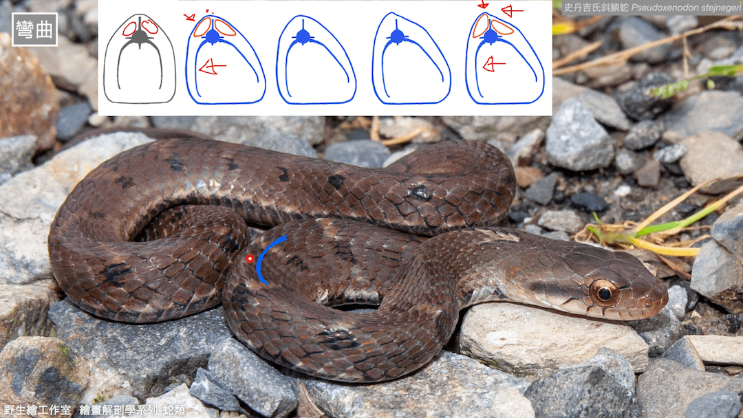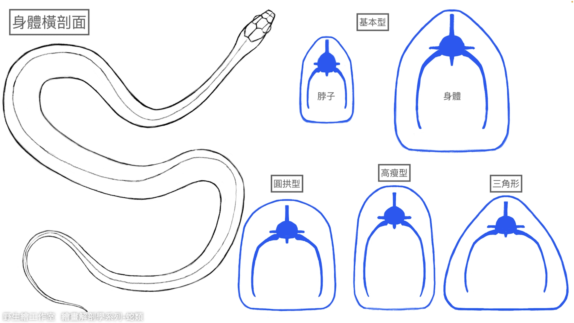 看似簡單的蛇類身體,其實暗藏許多細節。本章節談論身體粗細變化的基本規則,脊椎位置隨著活動的改變,體型變化與類群及棲地的關係,防禦時身體變形的基本方式等。