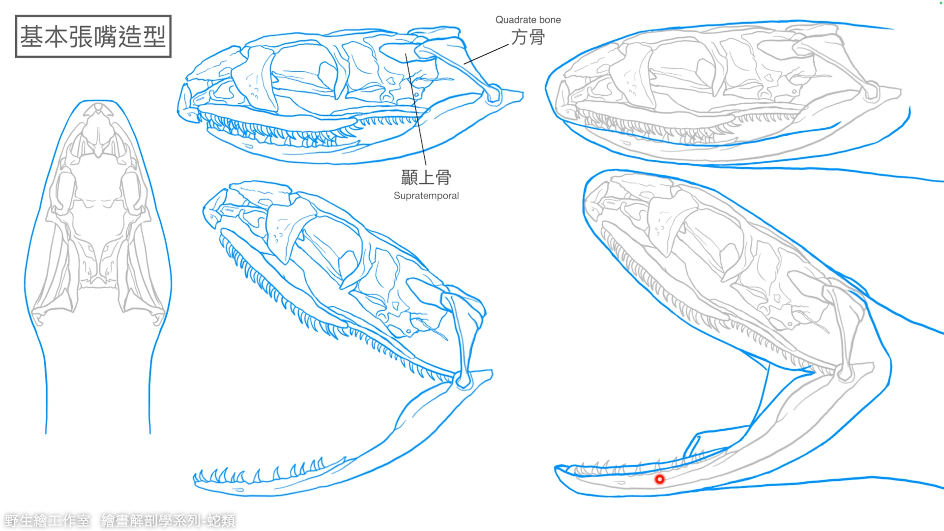 深入講解蛇類基本結構與畫法,討論常見的黃頷蛇科、眼鏡蛇科與蝮蛇科蛇類的差異與變化。內容包含基本頭部幾何結構、張嘴造型、活動時骨骼的影響、體型與類群及棲地的關係、鱗片細節與畫法等。對於認識蛇類構造及蛇類相關創作有極大的幫助。