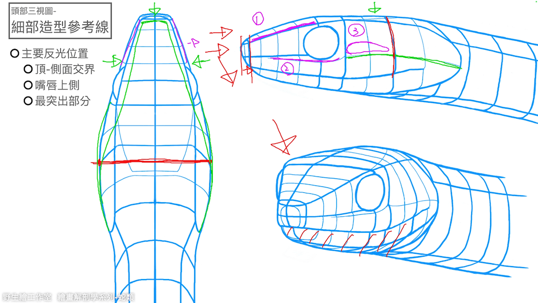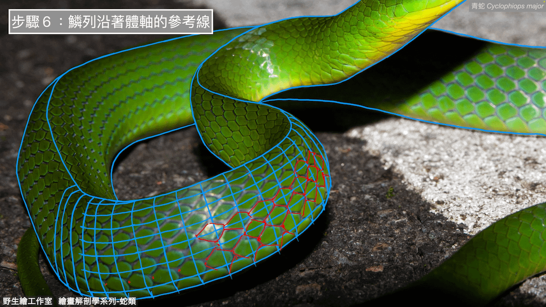 蛇類寫實畫法\頭部與身體立體造型\骨架與外觀的關聯\鱗片的區分\鱗片畫法\質感表現