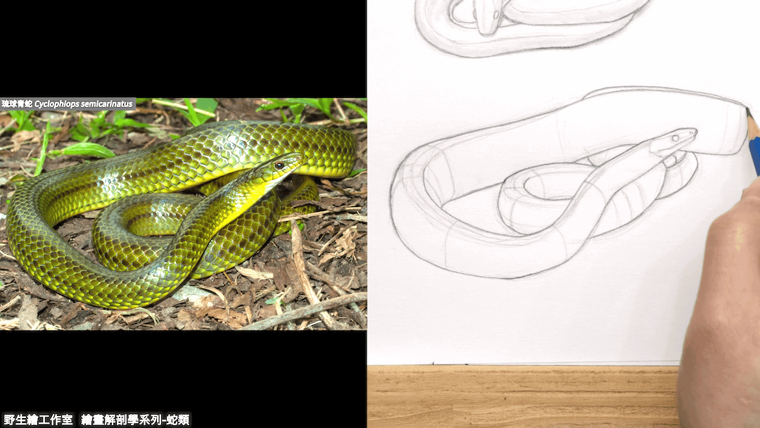 本課程是極少見專門針對蛇類的繪畫教學課程。從基本幾何造型開始,詳細介紹頭部與身體鱗片的區分與畫法,活動時骨架對外觀的影響,並比較台灣常見的黃頷蛇科、眼鏡蛇科以及蝮蛇科之間的差異與變化。並針對常見的繪畫錯誤進行討論以及蛇類AI生成圖片的區分方法,藉此避免自己動手畫時犯了基本的結構錯誤,讓辛苦完成的蛇類作品更加完美無缺。