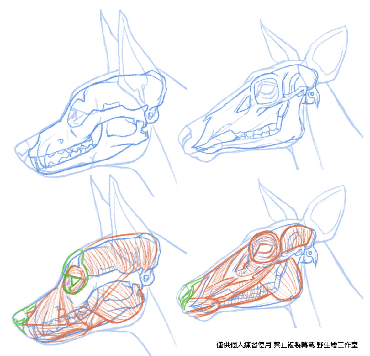 為了更好的表現出生物的自然樣貌,以解剖學為基礎的繪畫方式。因此需要學習許多解剖學知識及名稱,並進一步瞭解內部的骨骼、肌肉如何影響外觀的型態,有助於正確描繪出生物的外觀。也因為以繪畫為重點,因此與真正的解剖學的講述方式略有差異。而野生繪工作室將這麼複雜難懂的解剖學知識,整理並提取其中精華與大家分享。