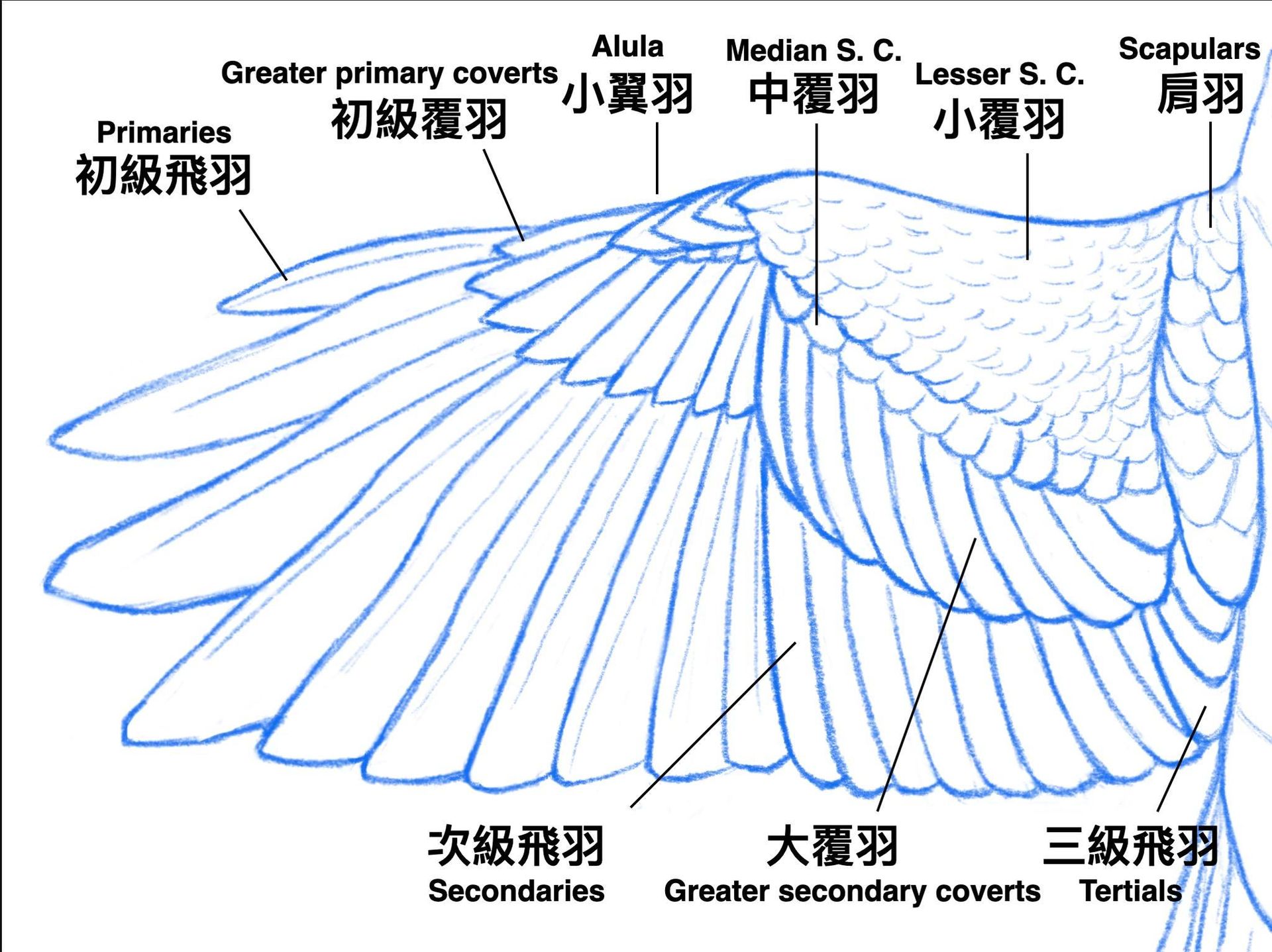 3. 學習動物的表面構造:因為我們最終還是需要表現外表的特徵與細節,因此學習生物的外部結構對於表現特徵是非常有幫助的。例如在畫鳥類時名字繁雜的羽毛代表著不同的大小、形狀以及功能,能夠記得這些不同羽毛的名稱以及位置能大大幫助細節的繪製。