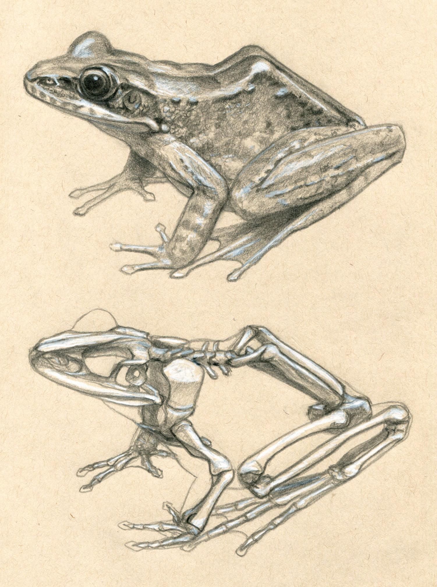 2. 嘗試了解表皮下的骨骼與肌肉:這邊不是要你記住所有的肌肉名稱,而是至少要記得不同生物類群的大肌肉群,對於理解生物在動作時的肌理,以及生物的關節可動範圍有非常大的幫助,同時也可幫助讓動物的姿態更加自然。此外肌肉收縮的感覺也可帶出爆發力以及氣氛的張力,這在無豐厚表皮衍生物(毛髮、羽毛等)可感覺到肌肉起伏與關節的生物特別重要(短毛哺乳類、兩棲爬行動物等)。